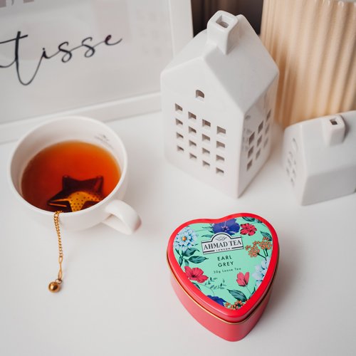 Elegantiškame širdelės formos indelyje yra 30 g birios arbatos pakuotėje iš folijos.